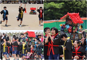 今年の学部種目のテーマは「おまつり」! GW明けから、生活単元学習や図画工作、体育など、様々な授業の時間を使って少しずつ準備を進めてきた子ども達。 大きいお神輿は全員で、小さいお神輿はクラスで担いで、会場を盛り上げました。 最後のダンスでは、元気いっぱいのキラキラ笑顔をたくさん見ることができました。