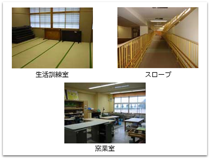 (2)障がい等に応じたきめ細かな個別指導やグループ指導をするために、生活訓練室、機能訓練室、行動観察室、木工室、陶芸室、農場等があります。